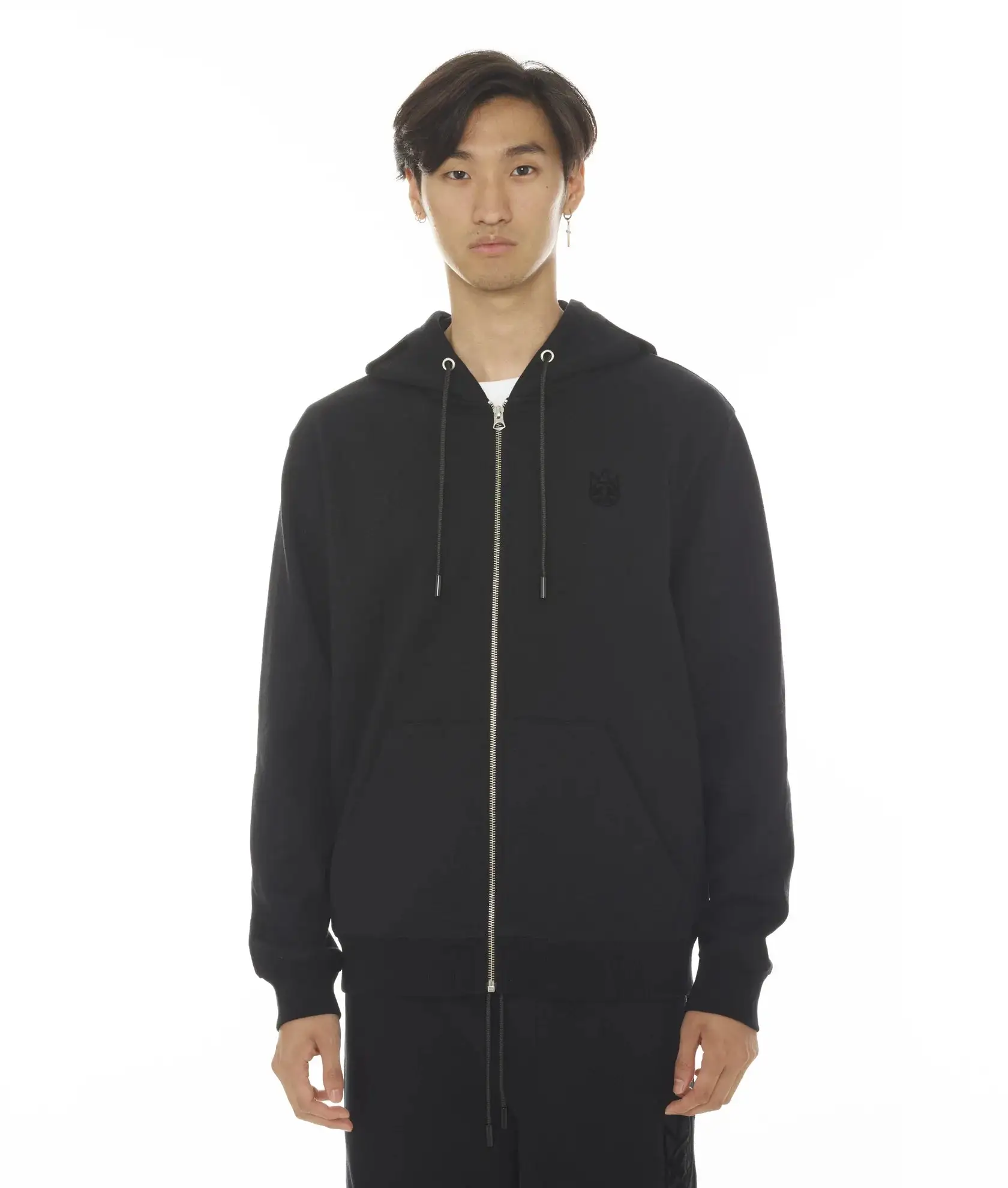 This black full zip heavy french terry hoodie is the perfect throw-on for a cool relaxed look. Our “shimuchan” logo is printed on the front and also on the back in a felt-raised applique.