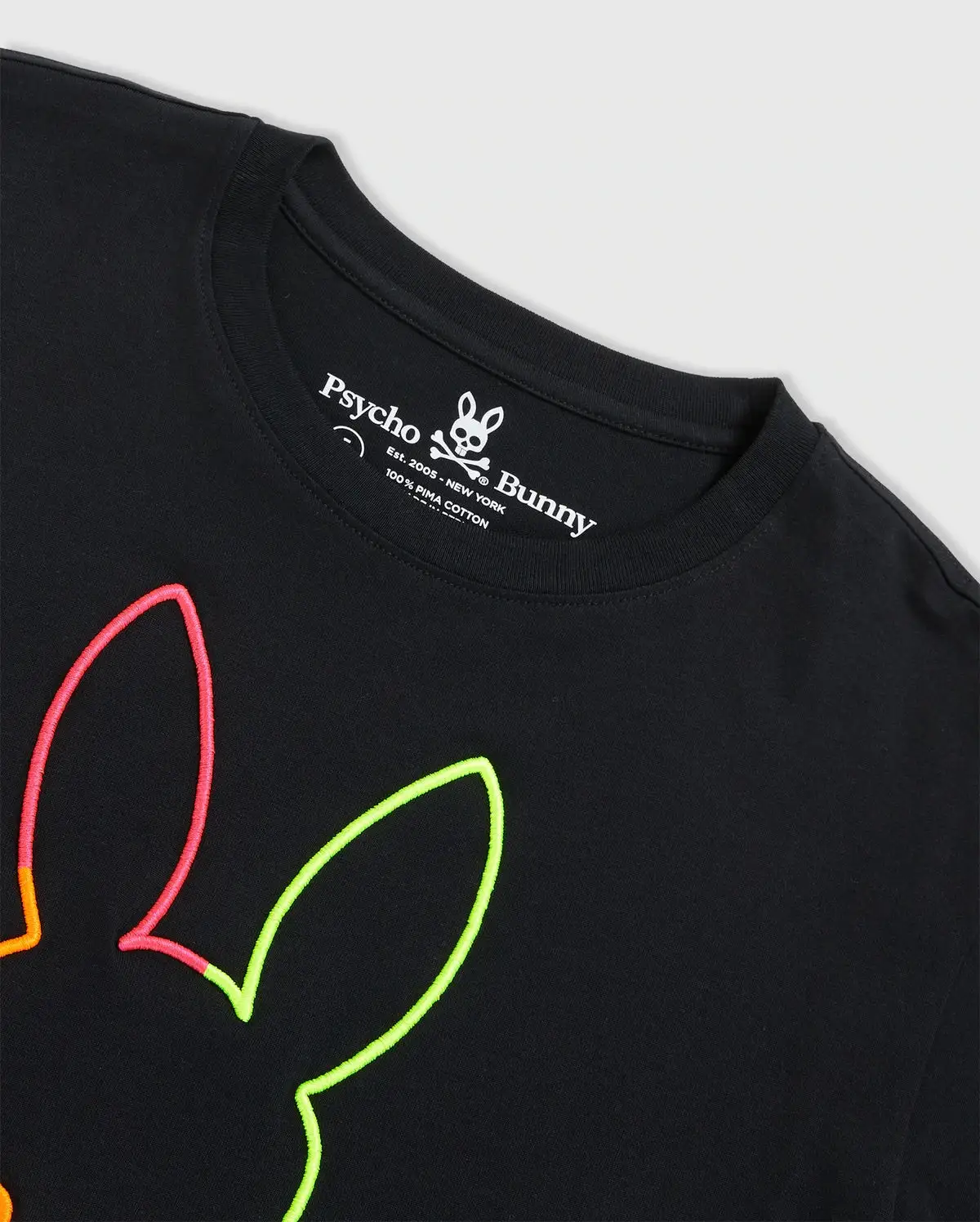 Give your layering game added character with the mens big and tall Leo Bunny tee. Crafted to lofty standards using only the softest Pima cotton, this tee is cut a little bit longer than the average T-shirt with a trim fit that hits the sweet spot between classic and slim. Taped seams in the shoulders provide comfort, while ensuring the Leo never loses its perfect fit. The Leo is finished with a raised Bunny outline embroidery, rendered in vibrant neon hues that stand apart whether worn as a statement tee or layered under a zip-up hoodie.