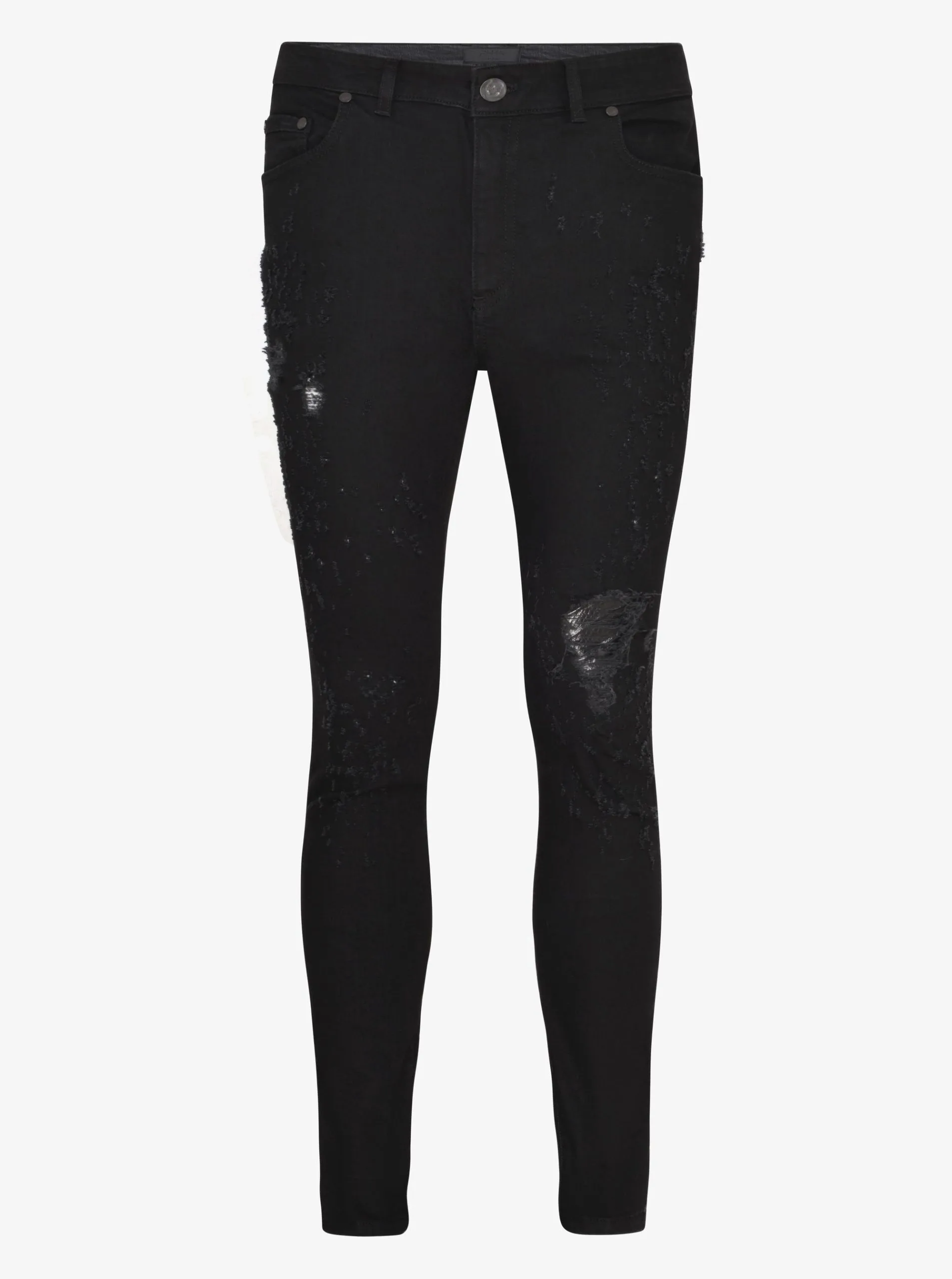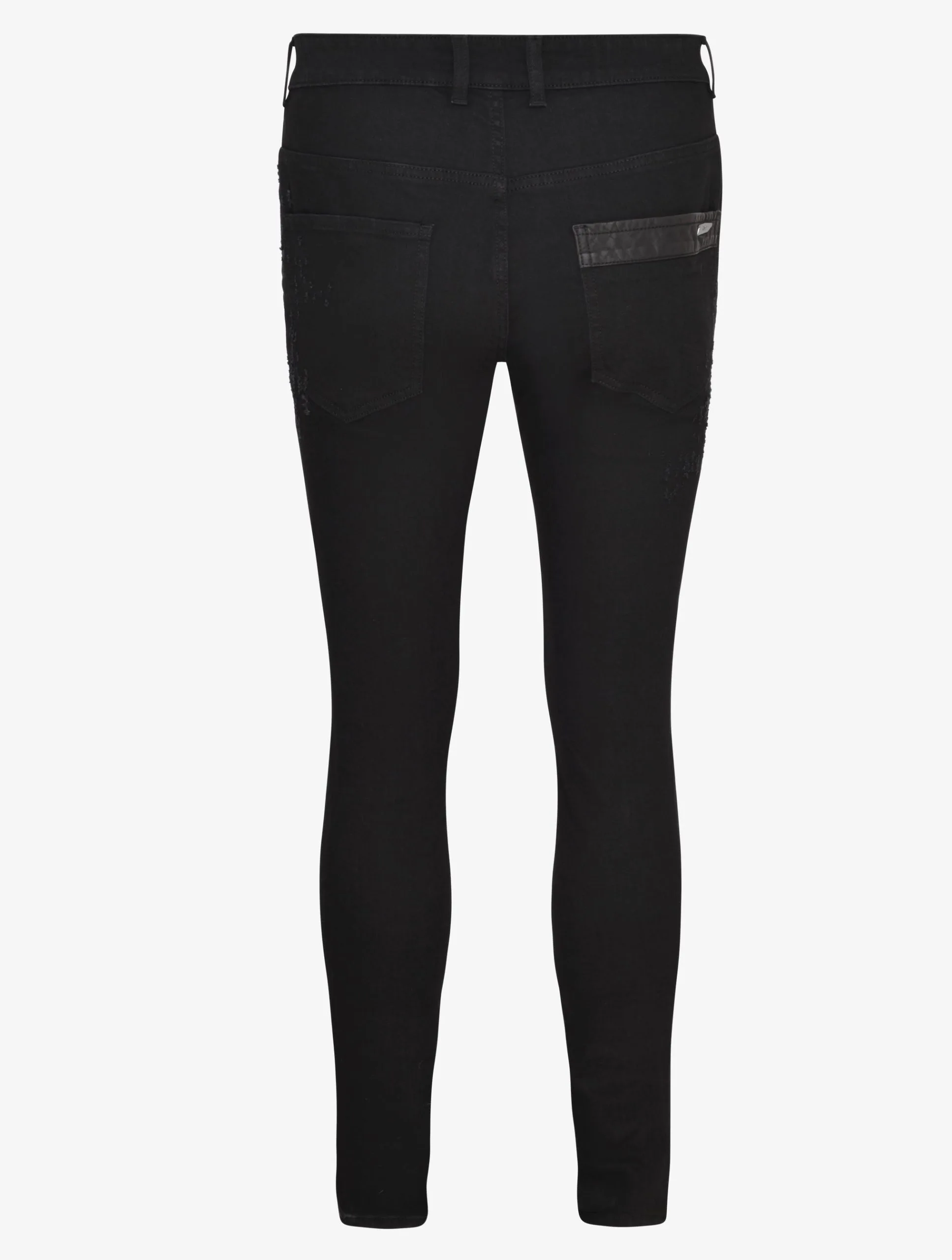 SKINNY FIT BLACK DENIM WITH BULLET HOLES AND PYTHON CUT PLASTIC PATCH ON KNEE. SIGNATURE PYTHON CUT LEATHER ON BACK POCKET WITH RH45 METAL PLAQUE. THE DENIM HAS A SUPER STRETCH. MADE IN ITALY.